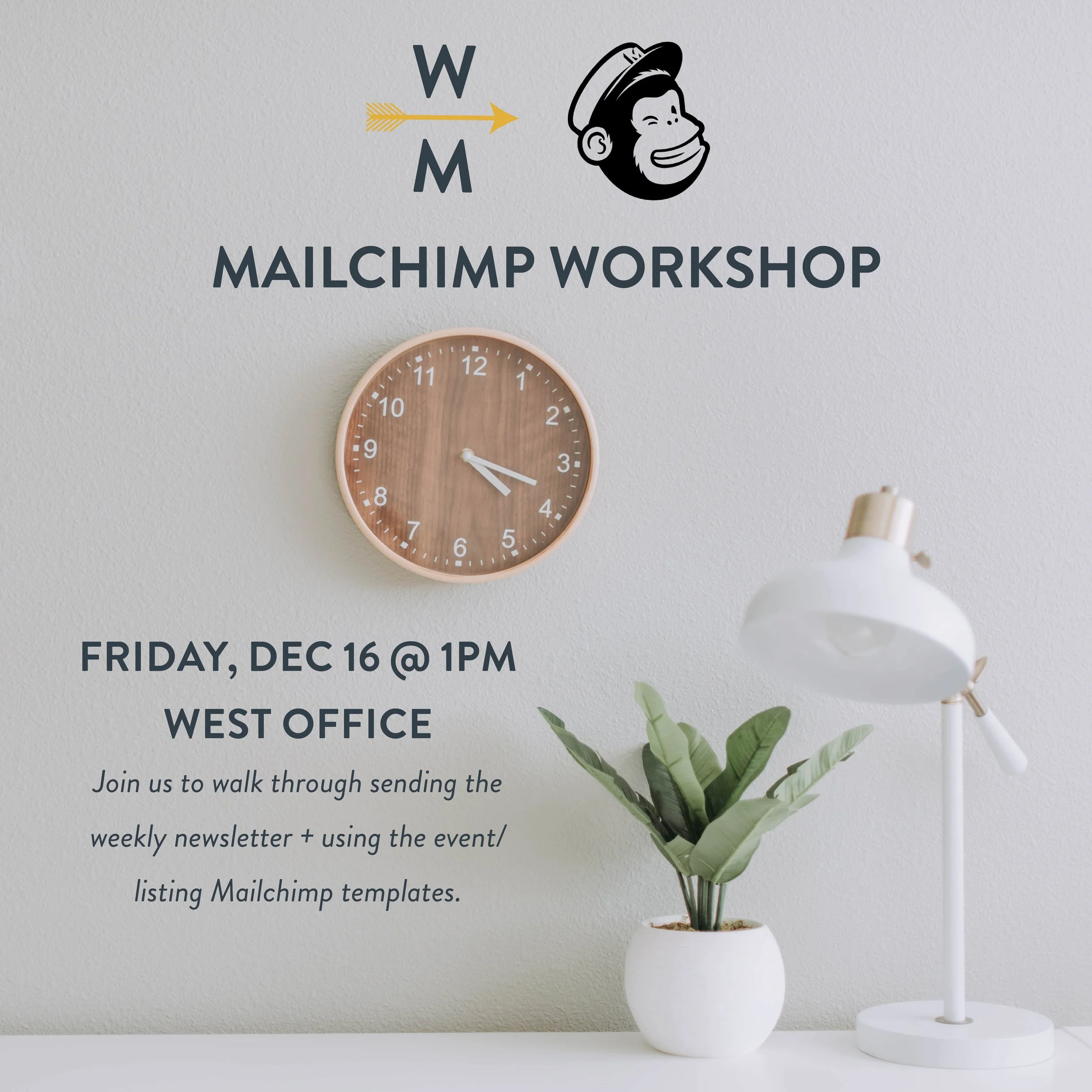 Mailchimp Workshop Friday, December 16, 2022 1:00 PM 2:00 PM 13:00 14:00 West + Main Homes 2010 Youngfield Street Golden, CO, 80401 United States (map) Google Calendar ICS Join us on Friday for a Mailchimp Workshop!We will walk through sending the weekly newsletter, go through an example of using the event/listing Mailchimp templates, and talk through customization options.